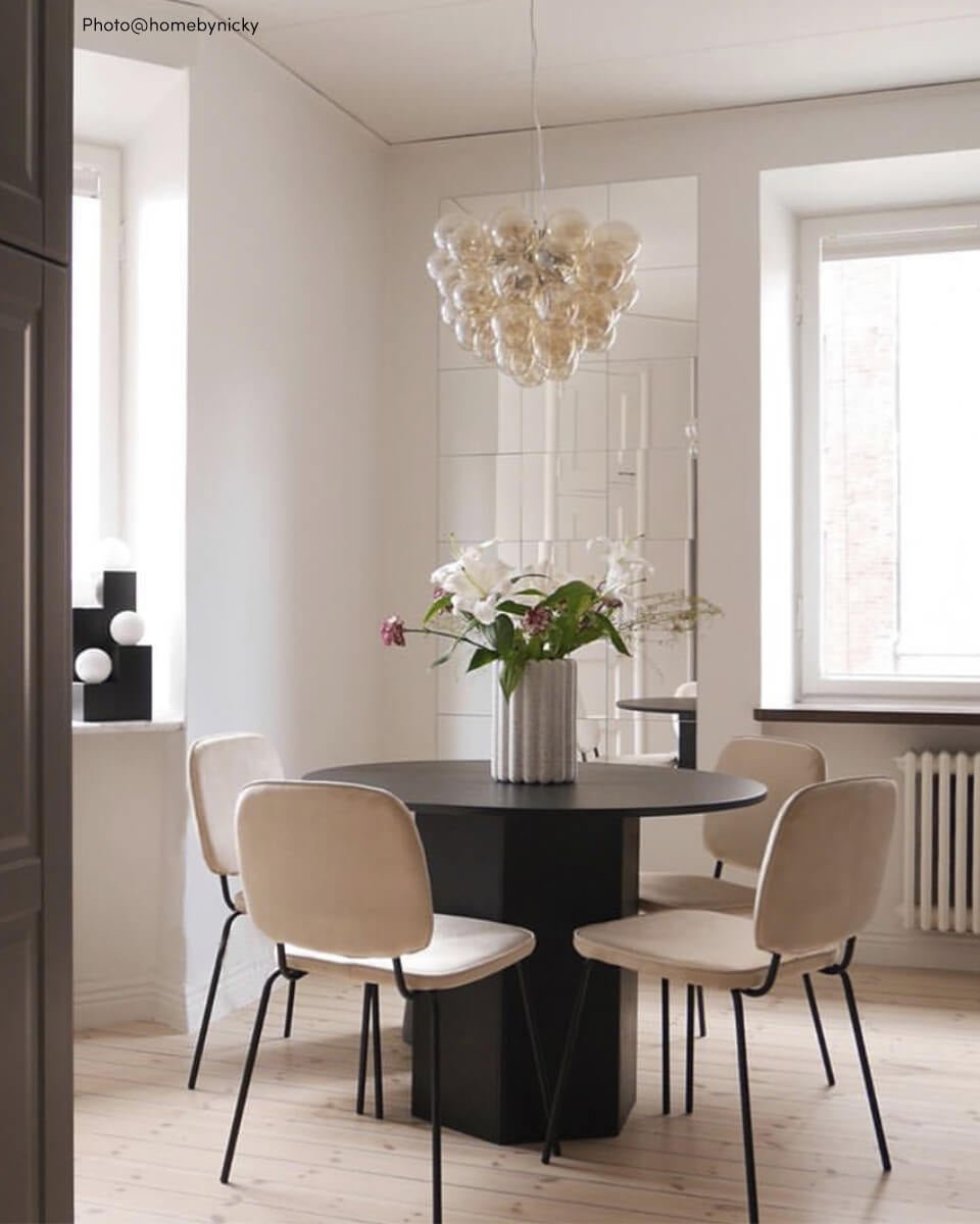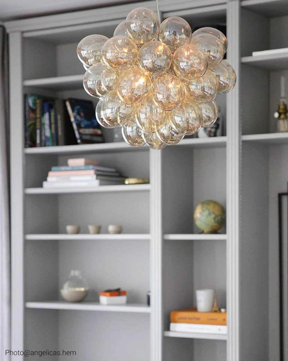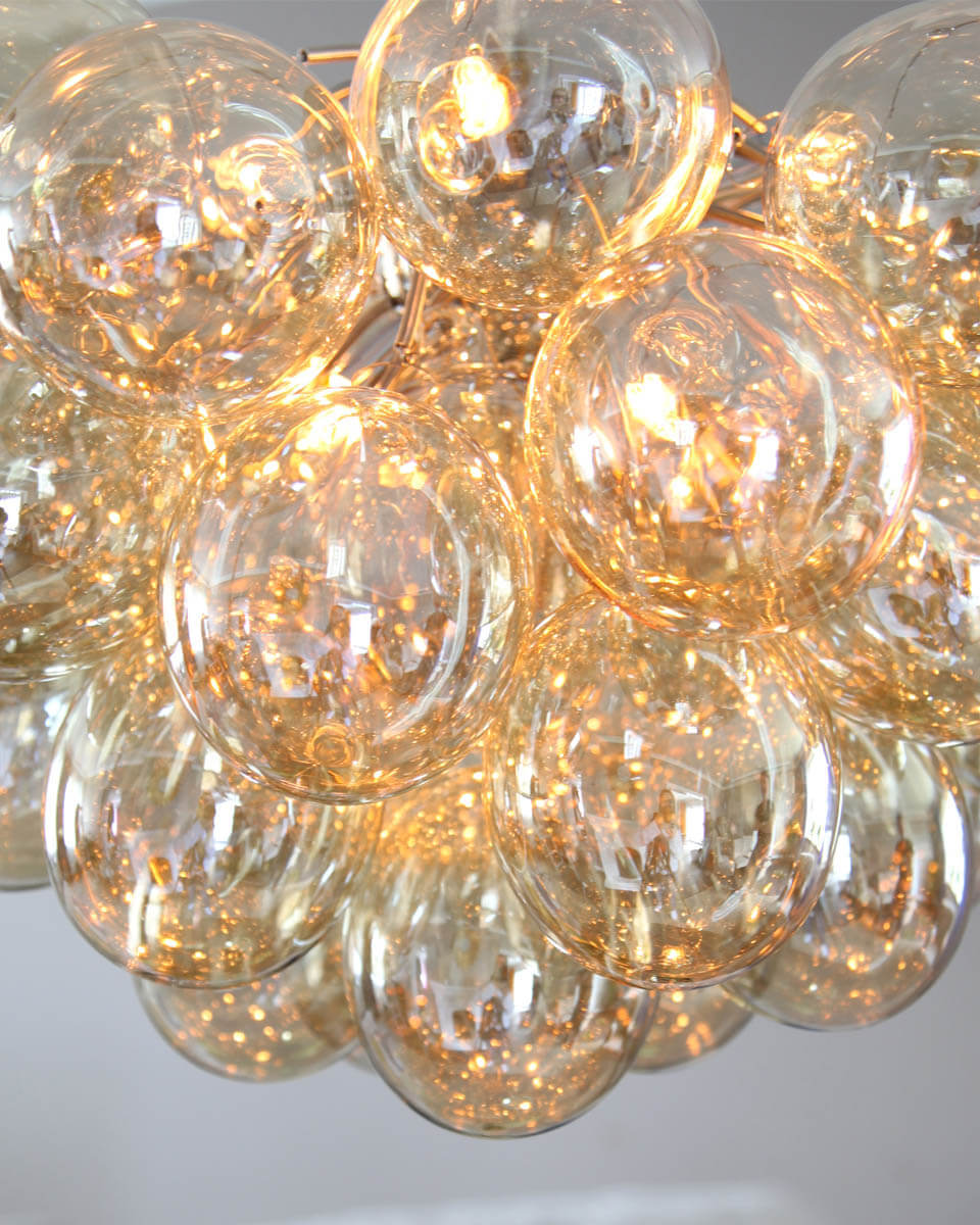 Unna dig höjden av lyx och stil med taklampan Gross, ett svävande moln av trettiosju stycken skira, munblåsta glaskupor som liknar atomer och ger ifrån sig ett underbart skimmer.